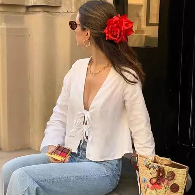 2024 Summer White Lace Up Shirts For Women‘s Elegant Loose Long Sleeve V-neck Blouse Female Solid Causal Street Chic lady Tops