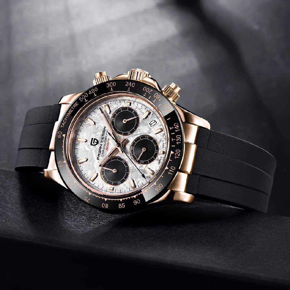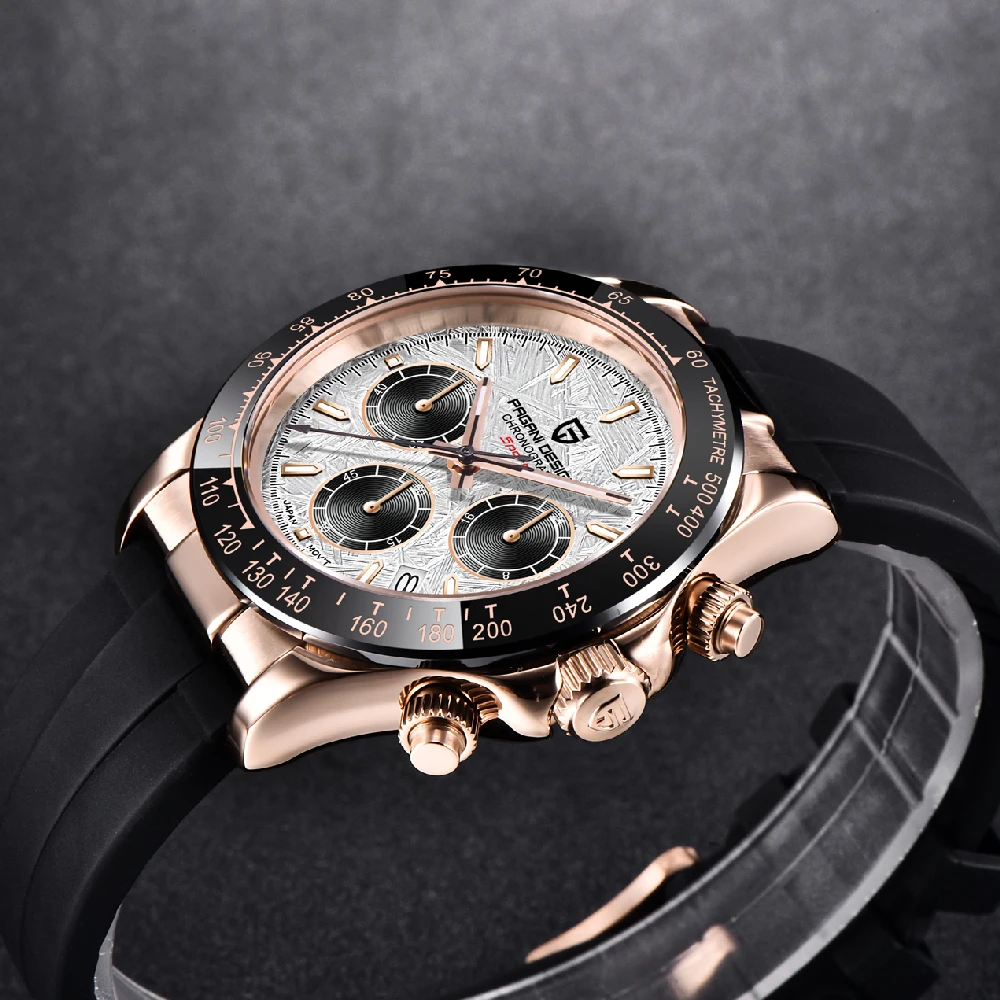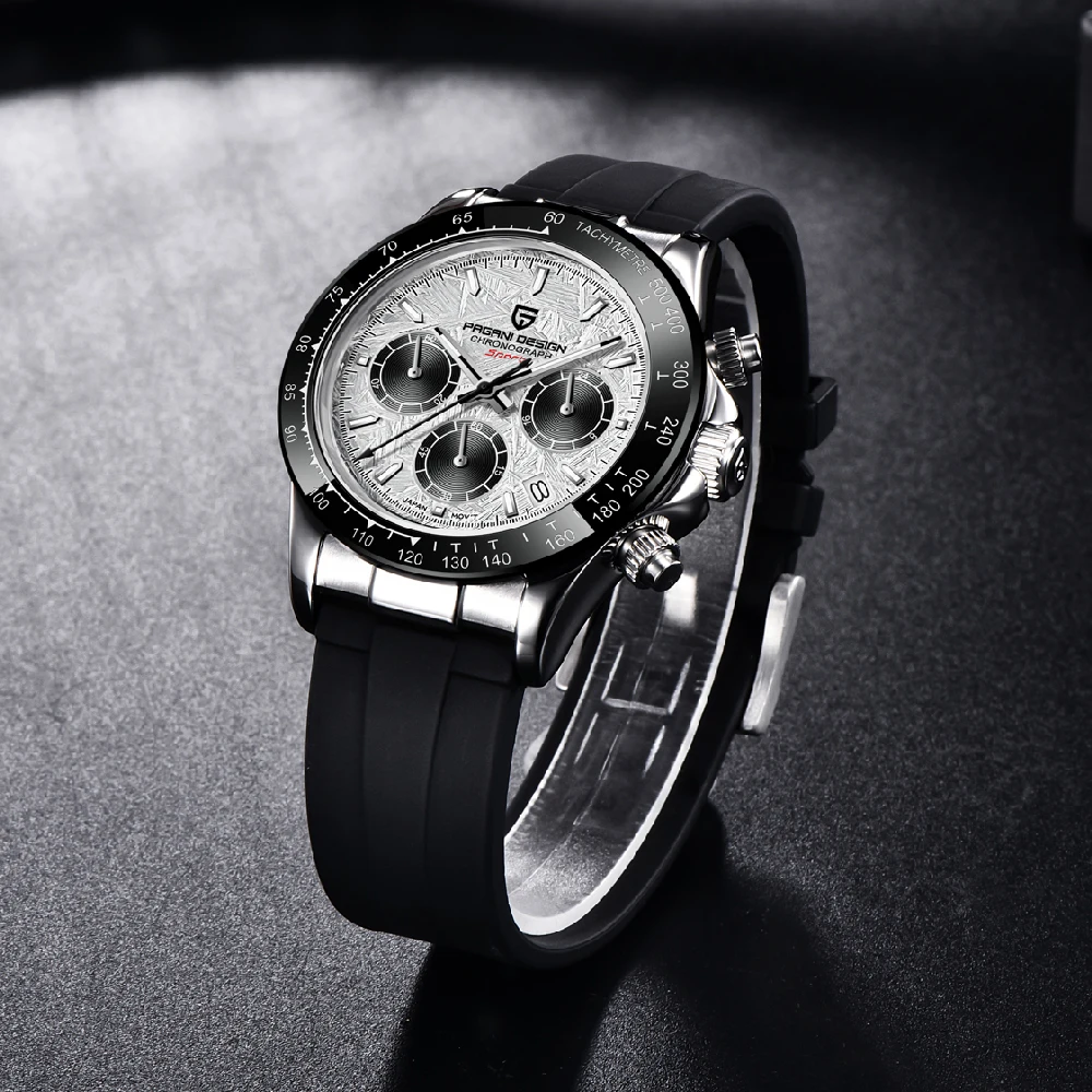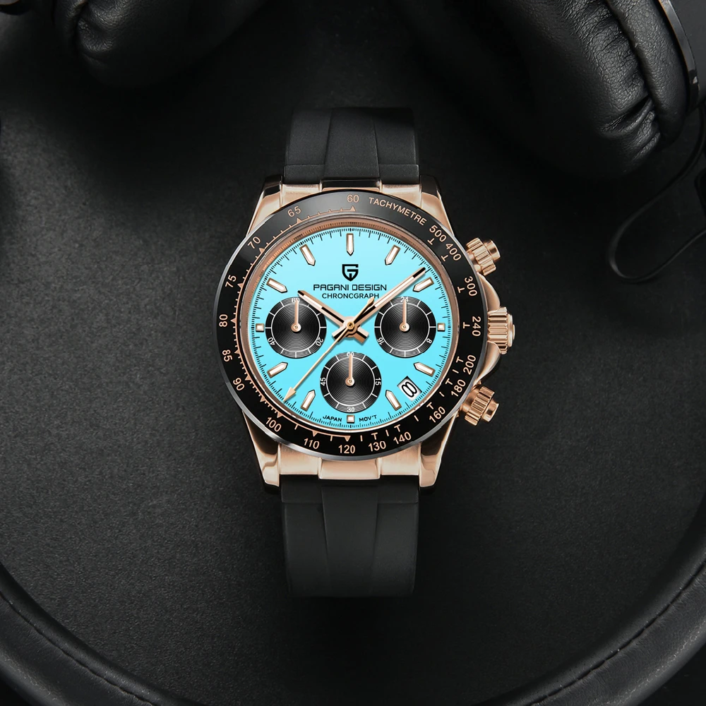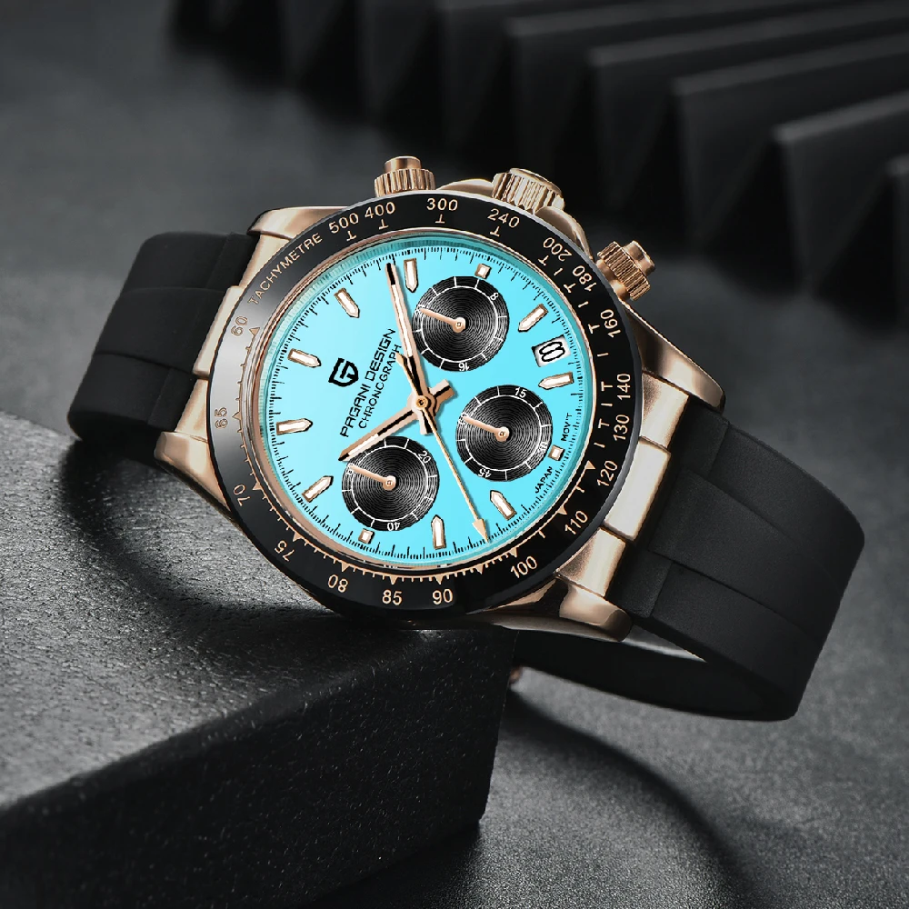 The RBB PAGANI DESIGN 2025 Quartz Chronograph Watch combines elegance with robust sports functionality. Featuring a durable stainless steel round case and a comfortable rubber sport band, this watch is designed for active lifestyles and luxury taste. The scratch-resistant sapphire crystal dial window protects a clear numberless dial with luminous needle hands for excellent visibility day or night.