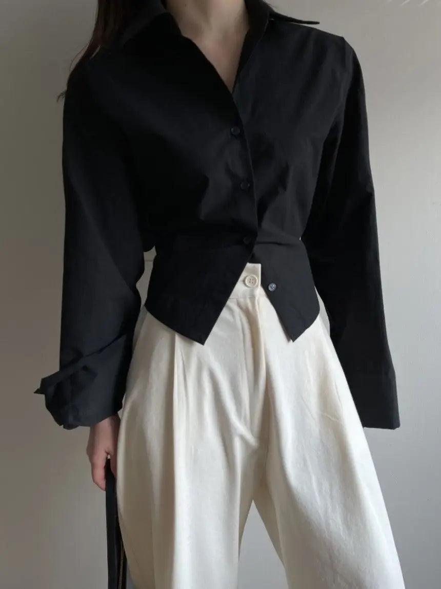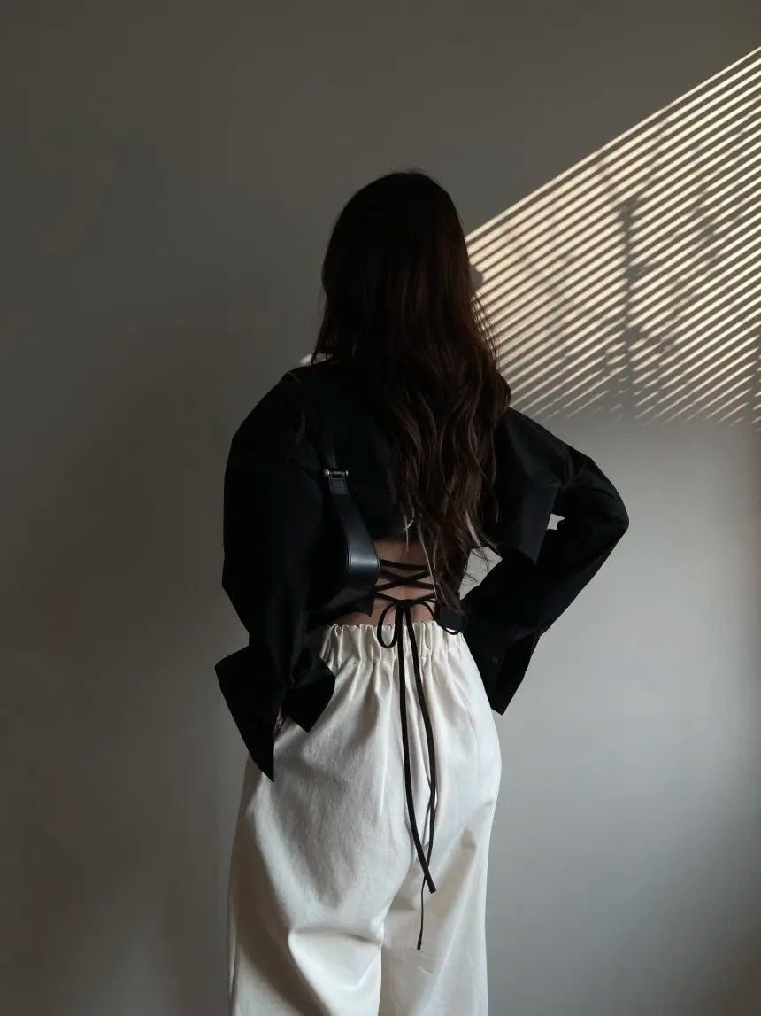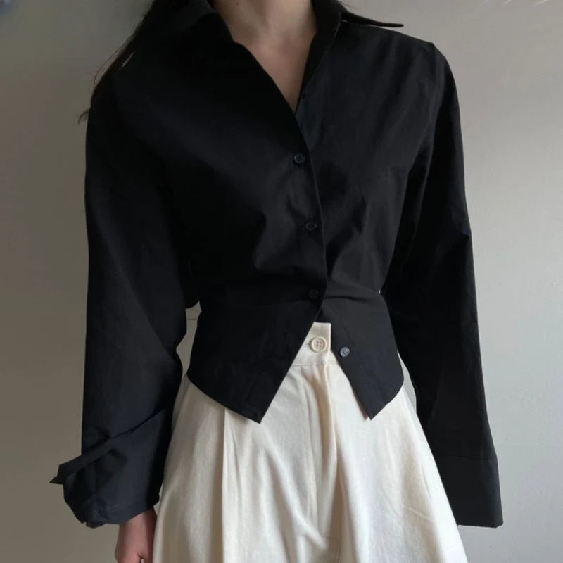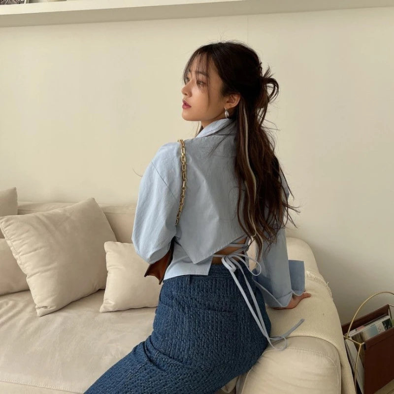 Chic Chiffon Shirts Women Criss-cross Drawstring Backless Trendy Design Turn-down Collar Single Breasted Ladies Solid Crop Tops