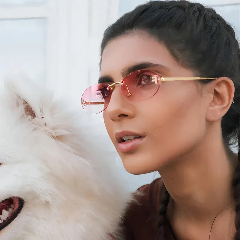 RBB Retro Oval Rimless Sunglasses – Unisex Elegant Diamond Style with Letter “F” Detailing