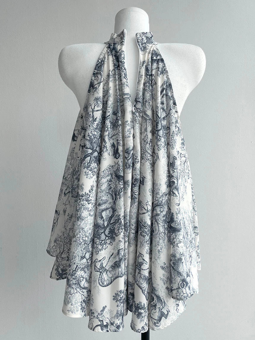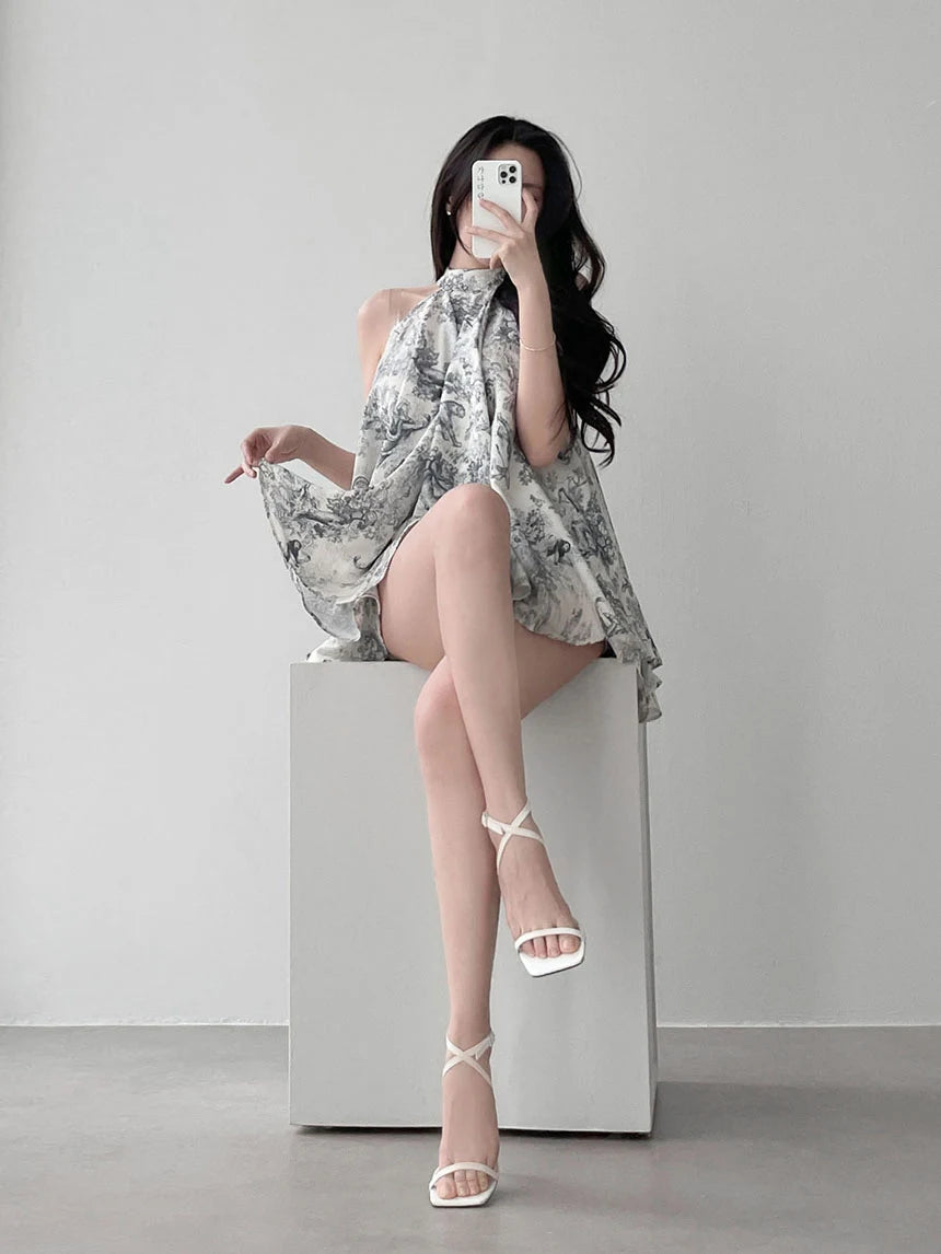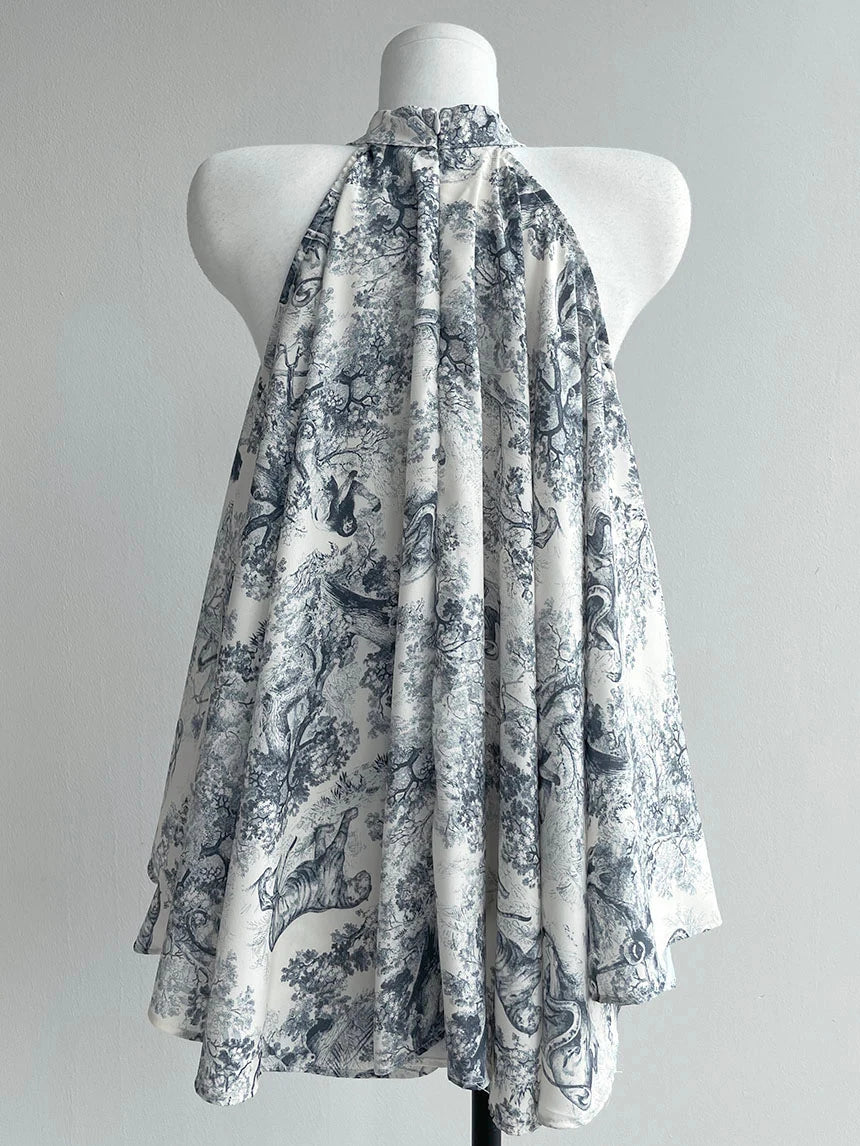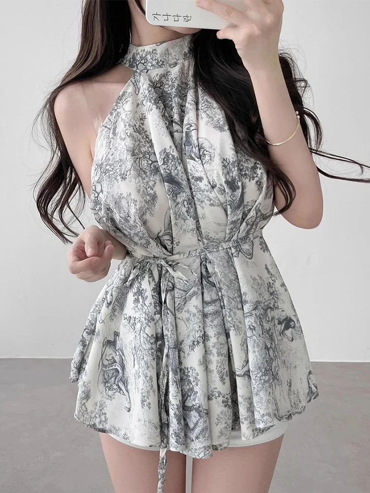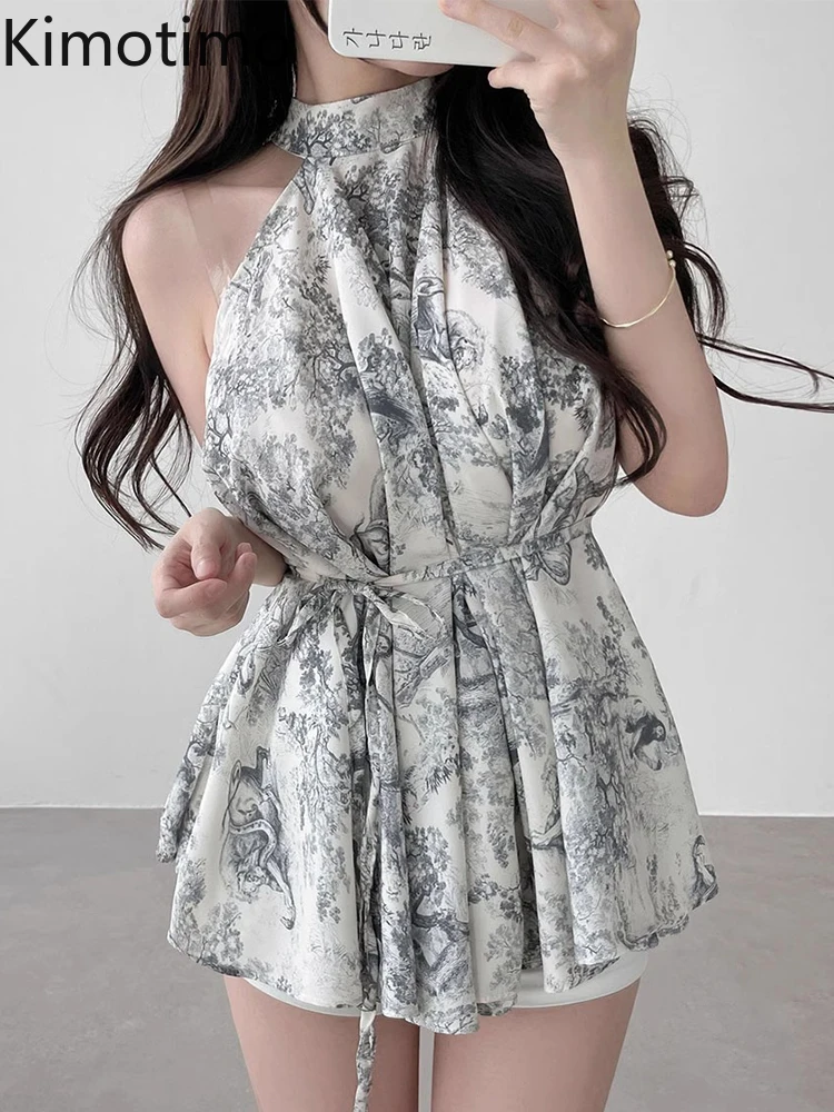 Kimotimo Summer Vintage Stand Collar Print Ladies Tops Korean Chic Lace Up Waist Halter Chiffon Blouses Elegant Fashion Shirts