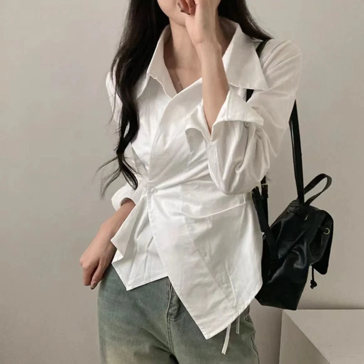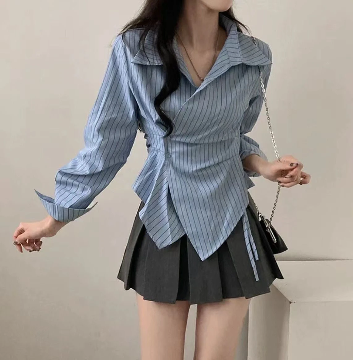 Korean Design Irregular Waist-Cinching Autumn Striped College Sle Long Sve Slimming Top Women's Faion Polyester irt