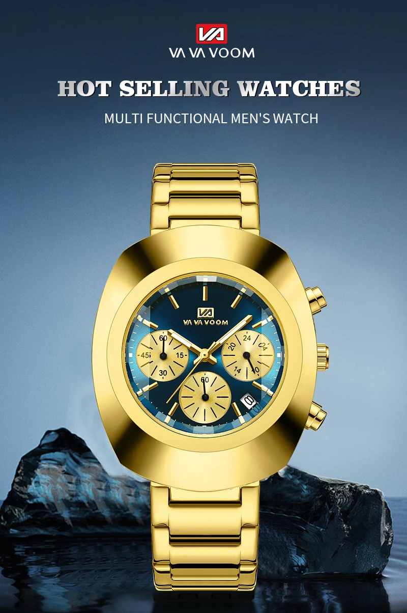 RBB Men's Multifunctional Quartz Watch – Blue & Gold Oval Dial with Stainless Steel Strap