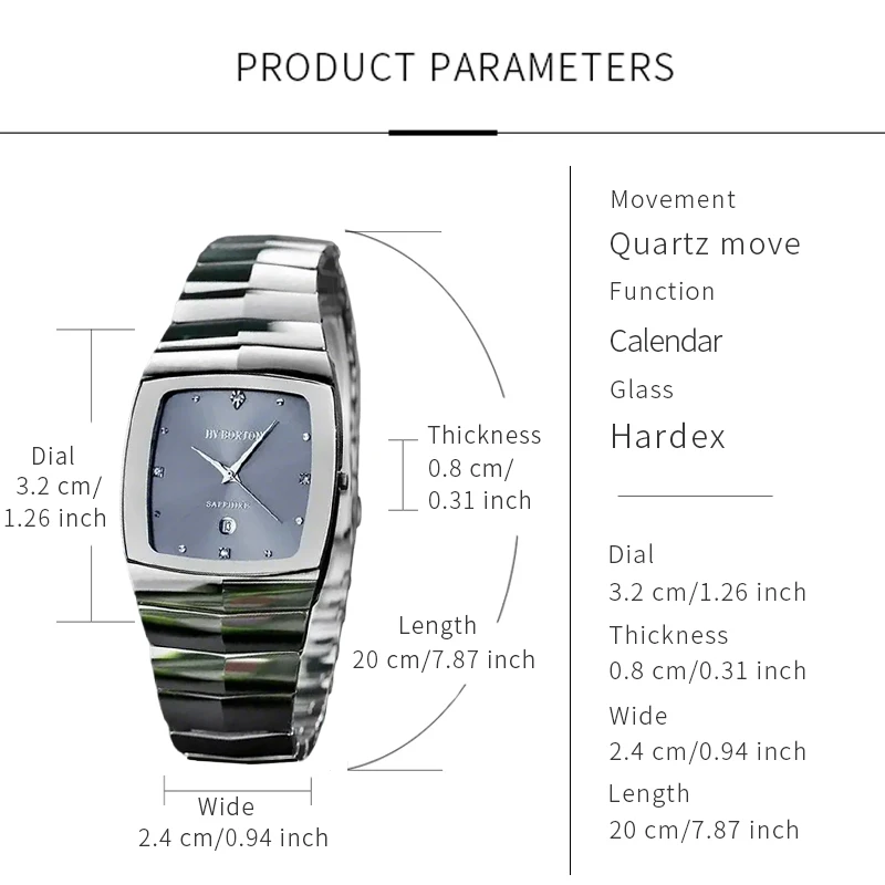 The RBB Men's Square Quartz Watch is crafted for the modern professional. Featuring a sleek square case, premium tungsten steel construction, and a scratch-resistant sapphire crystal dial window, this business-style timepiece delivers elegance and precision. With a hidden clasp and complete calendar function, it’s perfect for both boardroom and casual wear.