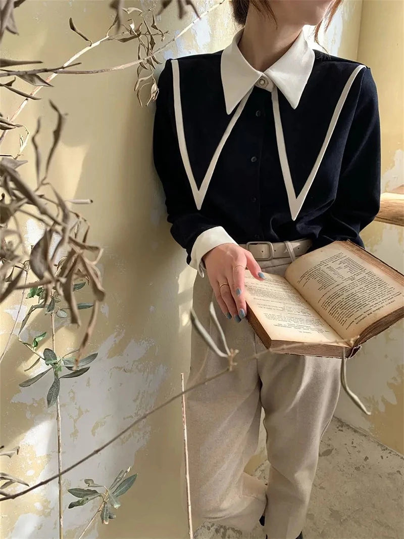 MEXZT Vintage Chiffon Shirts Women Elegant Patchwork Long Sleeve Blouses Office Lady Korean Black Turn Down Collar Casual Tops