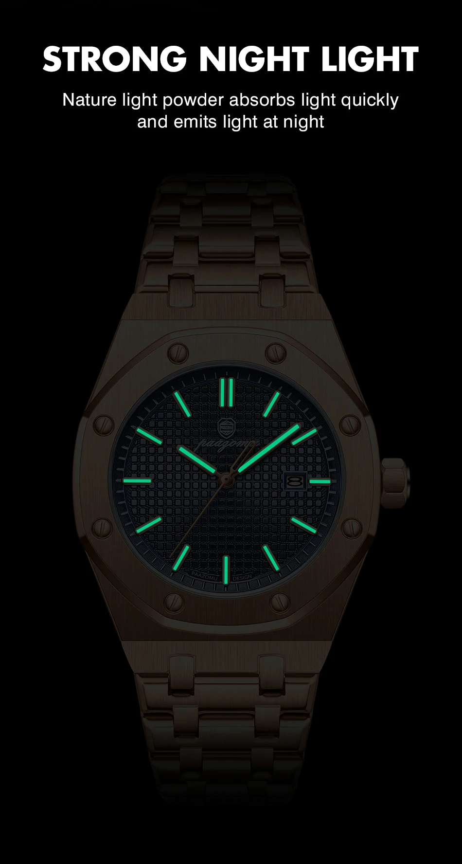 Experience a blend of luxury and functionality with the RBB PENGAGAR Square Luxury Men's Watch. This sophisticated timepiece features a modern square stainless steel case with a sleek numberless dial and luminous hands for easy reading in any light. Designed for both casual and business wear, it includes essential features such as auto date, complete calendar, week display, and 3ATM water resistance suitable for everyday activities including swimming.