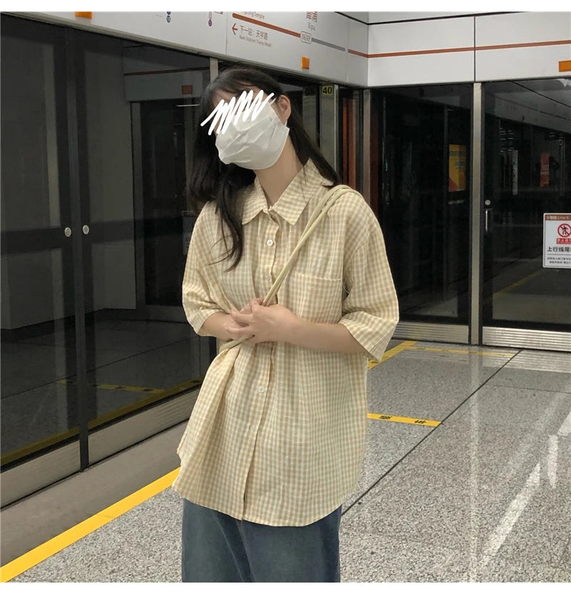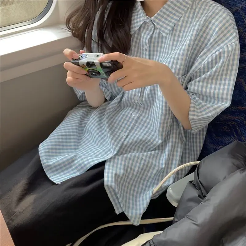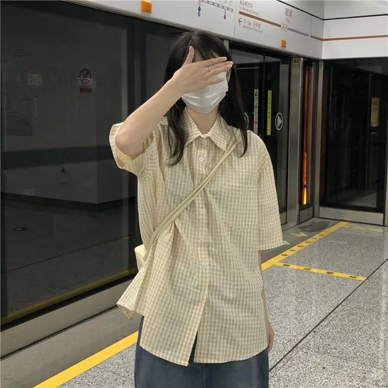 Plaid Shirts for Women Youthful Commuting Fresh Pocket Summer Short Sleeve Tops Tender Hipster Vintage American Style All-match