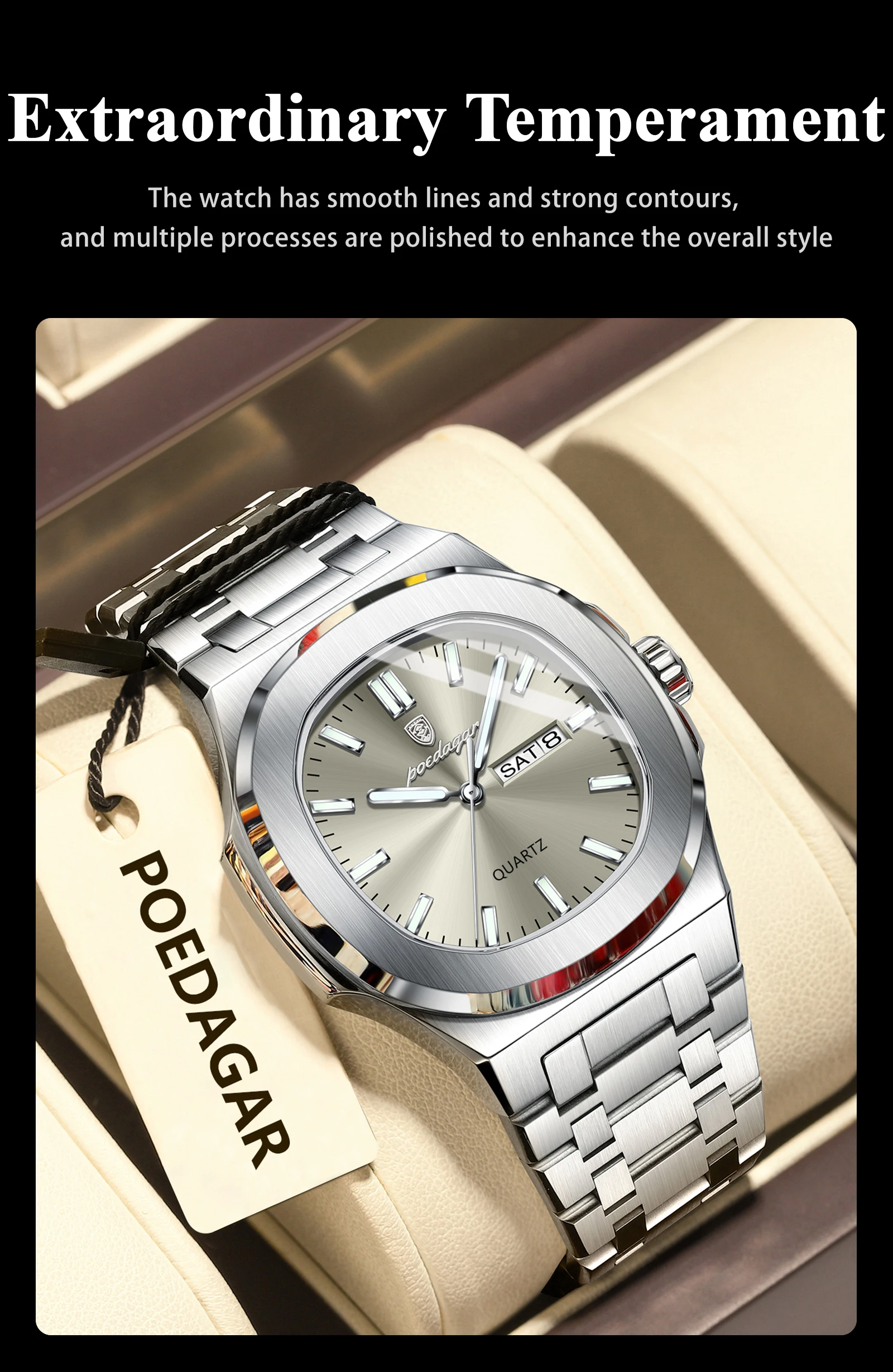 The RBB POEDAGAR Original Men's Watch combines timeless design with practical features for the modern professional. Crafted with a square stainless steel case and a sleek stainless steel band, this watch exudes elegance and durability. Its numberless dial with luminous hands provides clear readability in all lighting conditions.