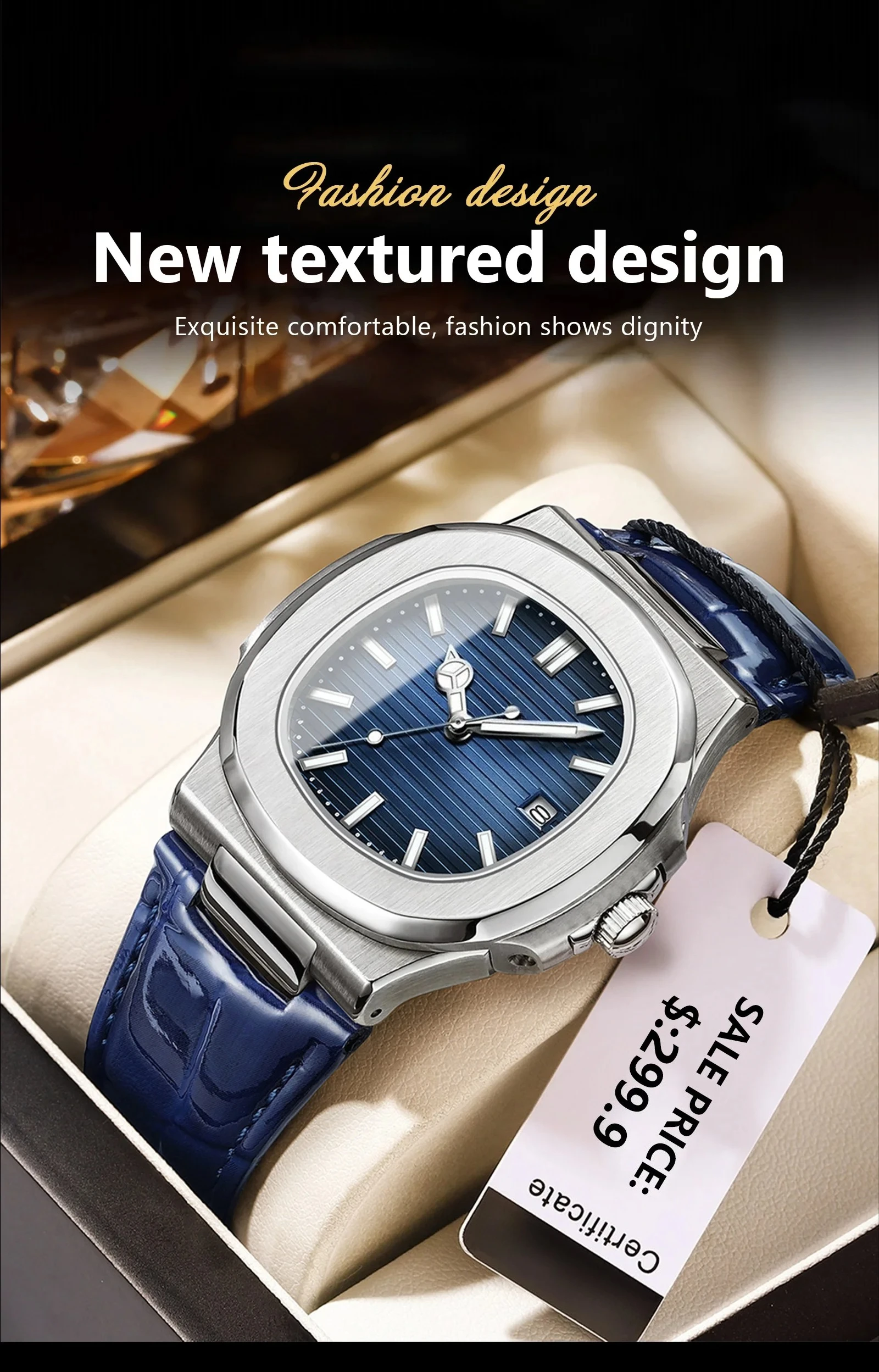 RBB Luxury Men’s Square Quartz Watch – Waterproof, Luminous Date Display, High-Quality Leather Strap