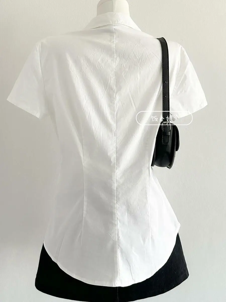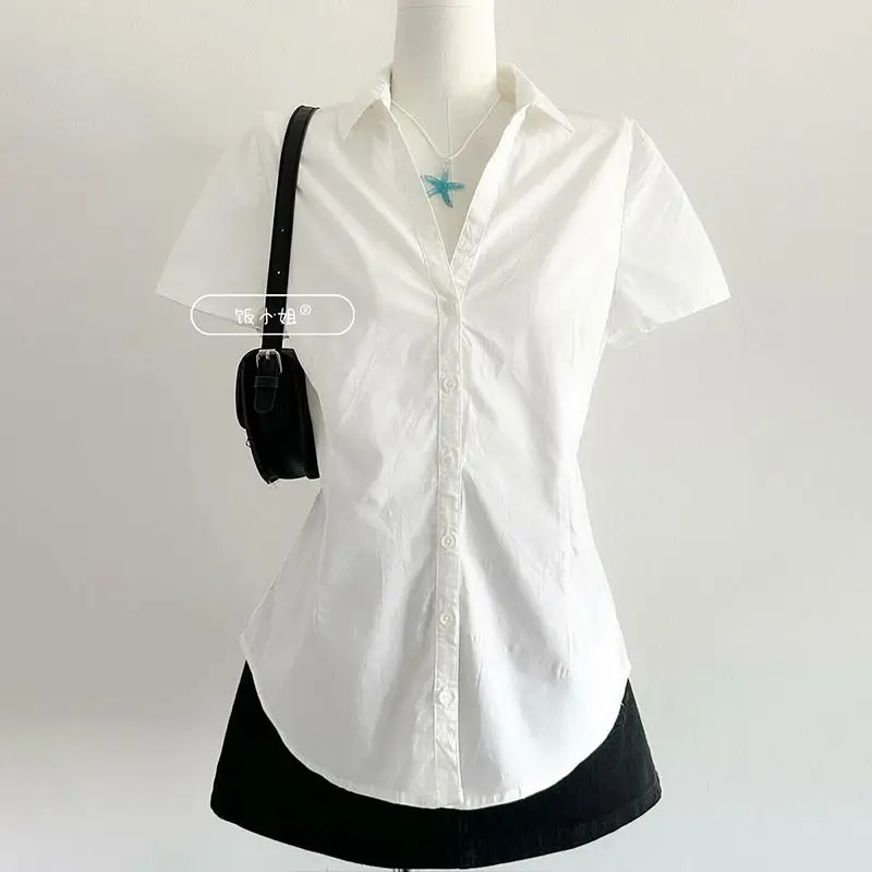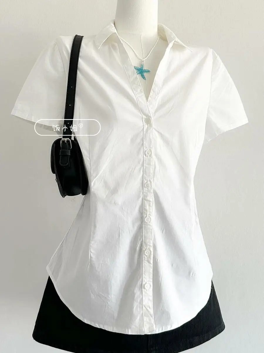 Preppy Style Fashion Turn Sown Collar V Neck Short Sleeve Blouse All Match Harajuku Simple Slim Fit Clothes Y2k Buttoms Tops