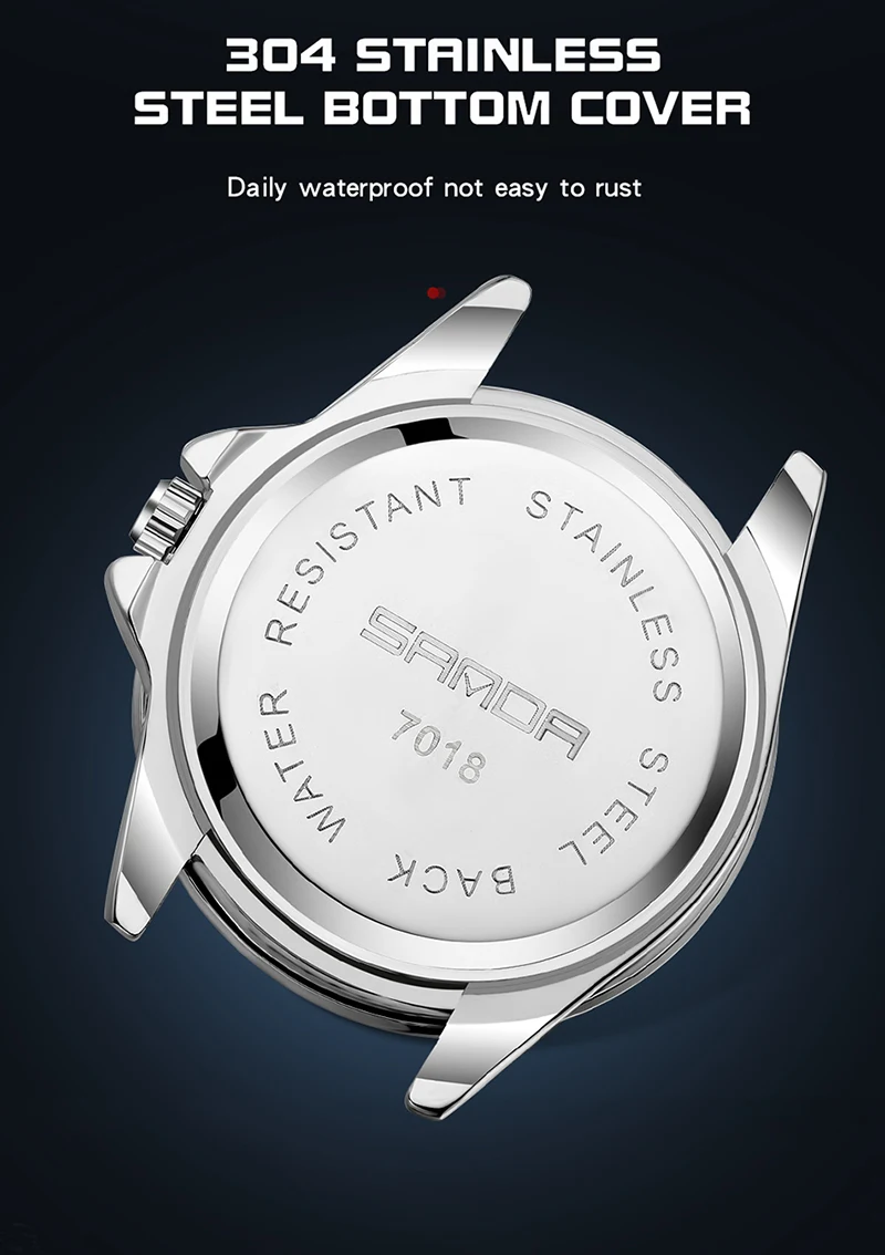 Elevate your wrist game with the RBB SANDA 7018 Quartz Watch, crafted for modern men who demand performance and style. This sporty yet business-ready timepiece features a dual time zone display, auto-date, shock resistance, and a luminous Roman numeral dial, all housed in a durable alloy case.