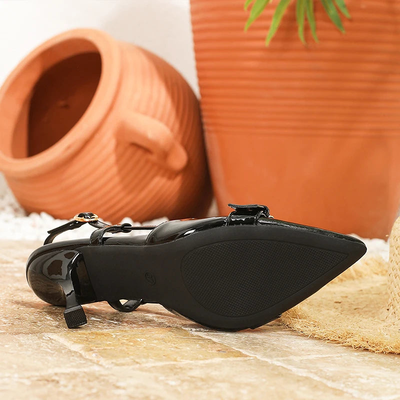 Elevate your fashion game with the RBB Super High Heels, made for bold, confident women. With a sleek 9cm stiletto heel, glossy PU finish, and a secure buckle strap, these pointed-toe slingbacks are your go-to heels for parties, weddings, or evening glamour.