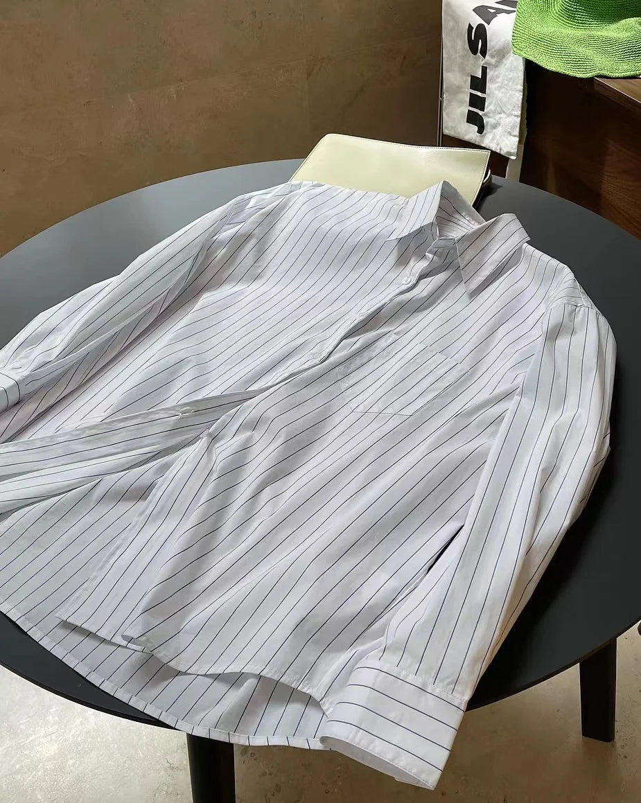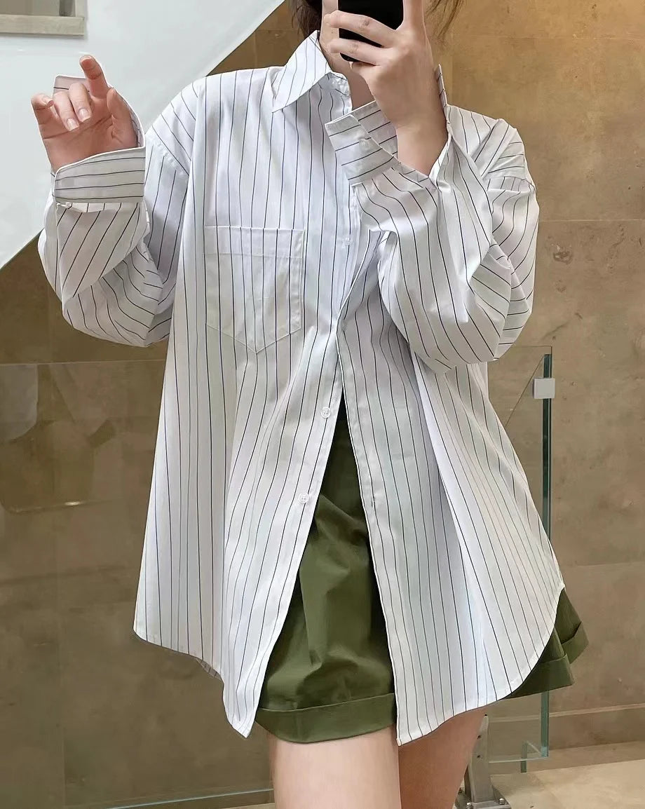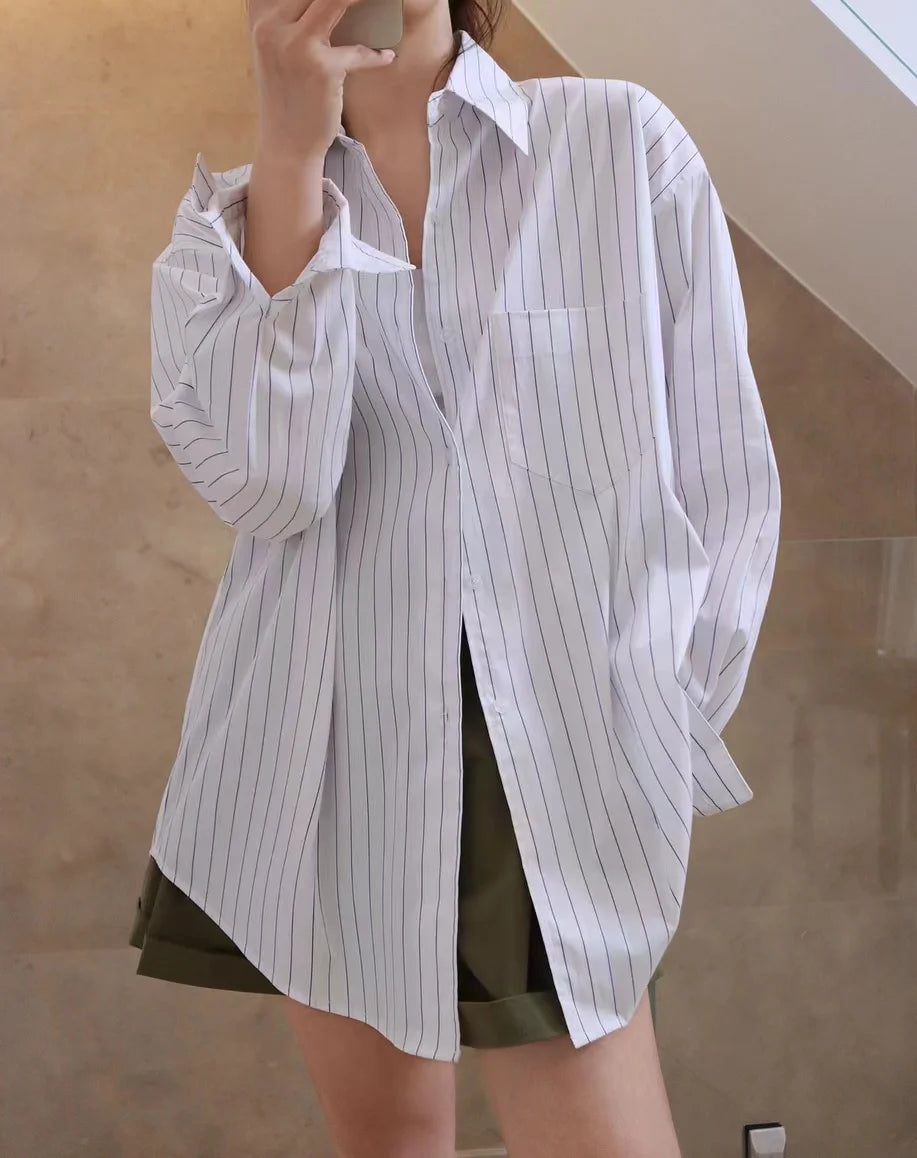 Spring/Summer Women's Striped Polo Neck Long Sleeve Pocket Decoration Loose Shirt