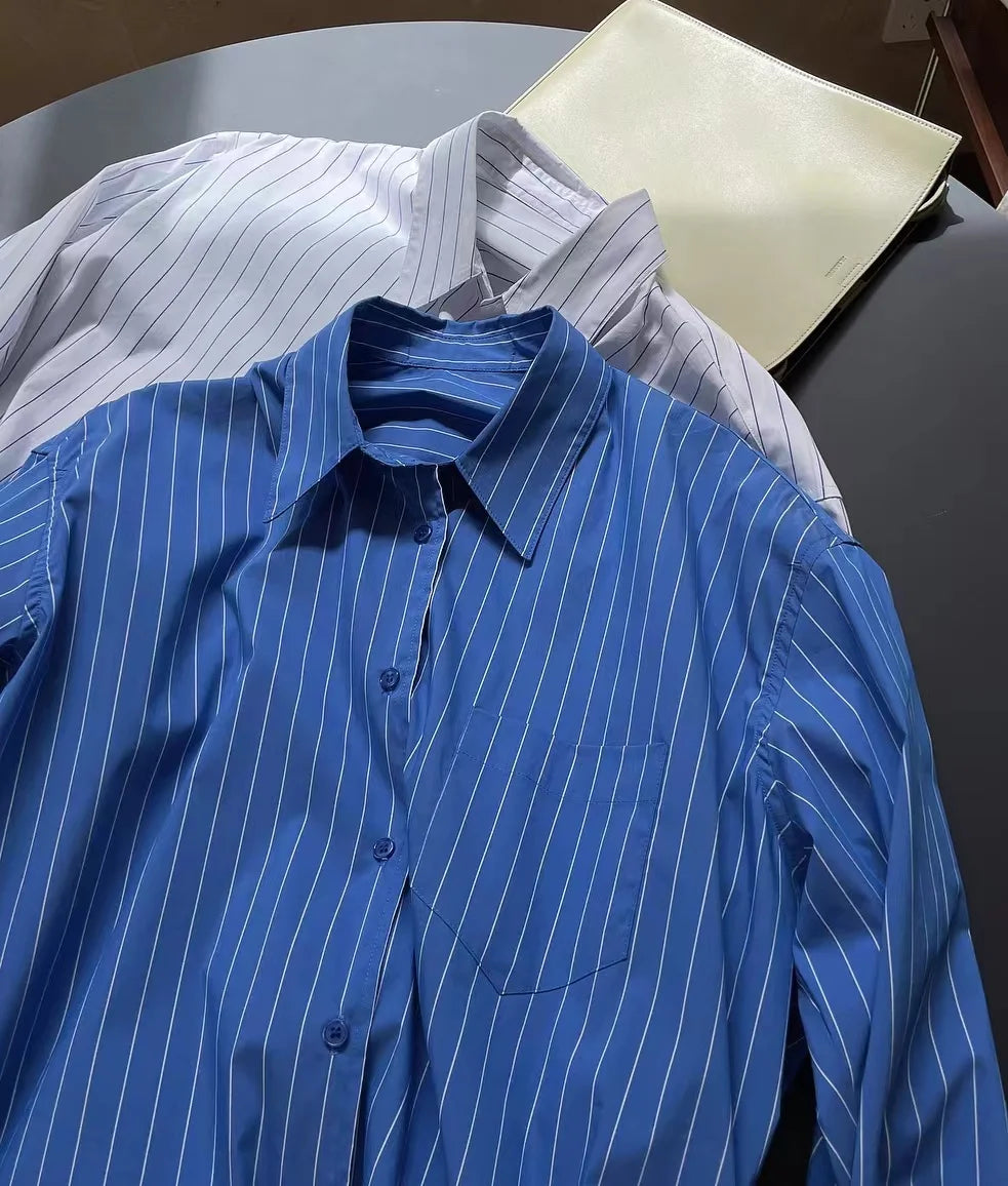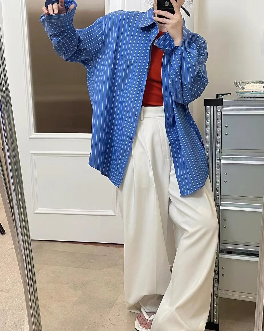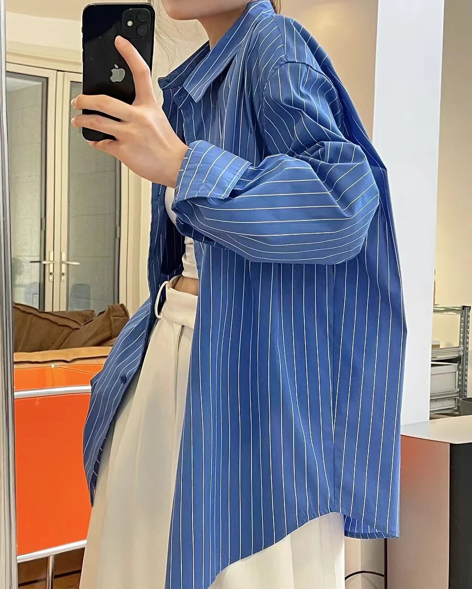 Spring/Summer Women's Striped Polo Neck Long Sleeve Pocket Decoration Loose Shirt