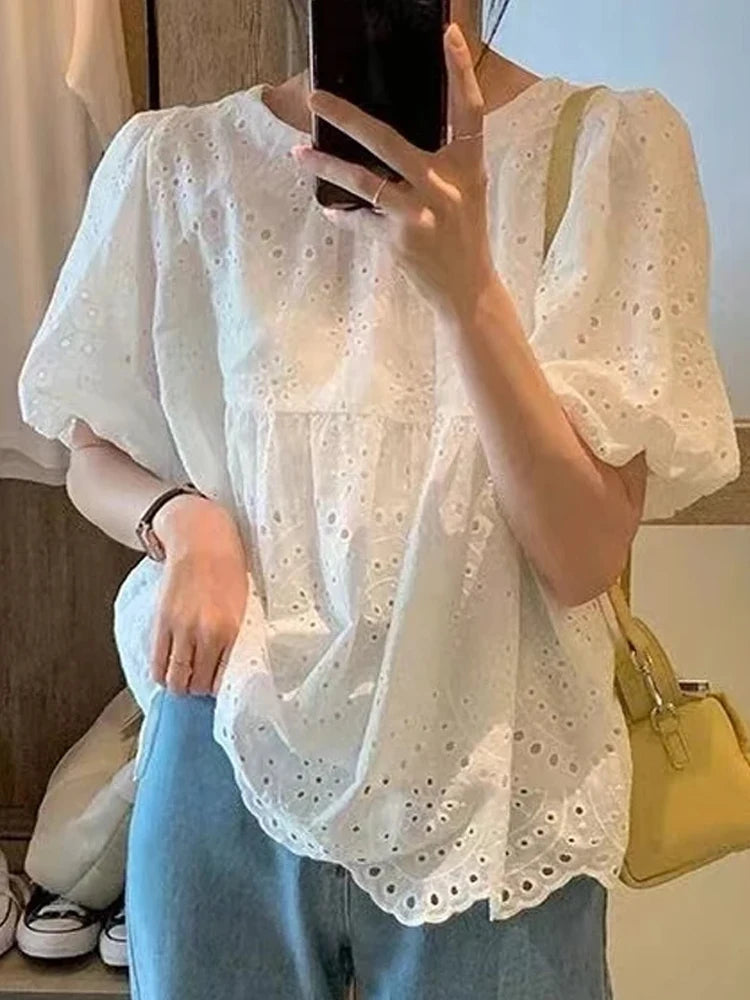 Summer French Style Embroidery Hollow Out Shirt New White Lace Blouse for Women Short Puff Sleeve Tops Round Collar Clothes 930