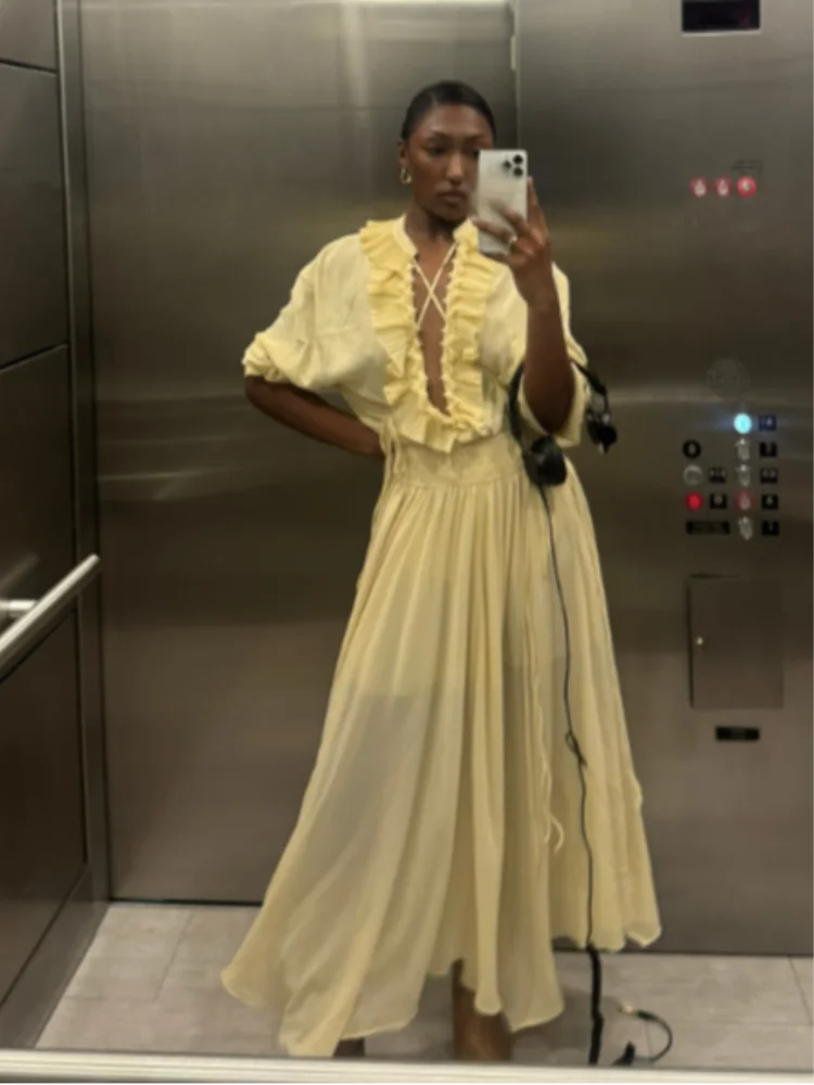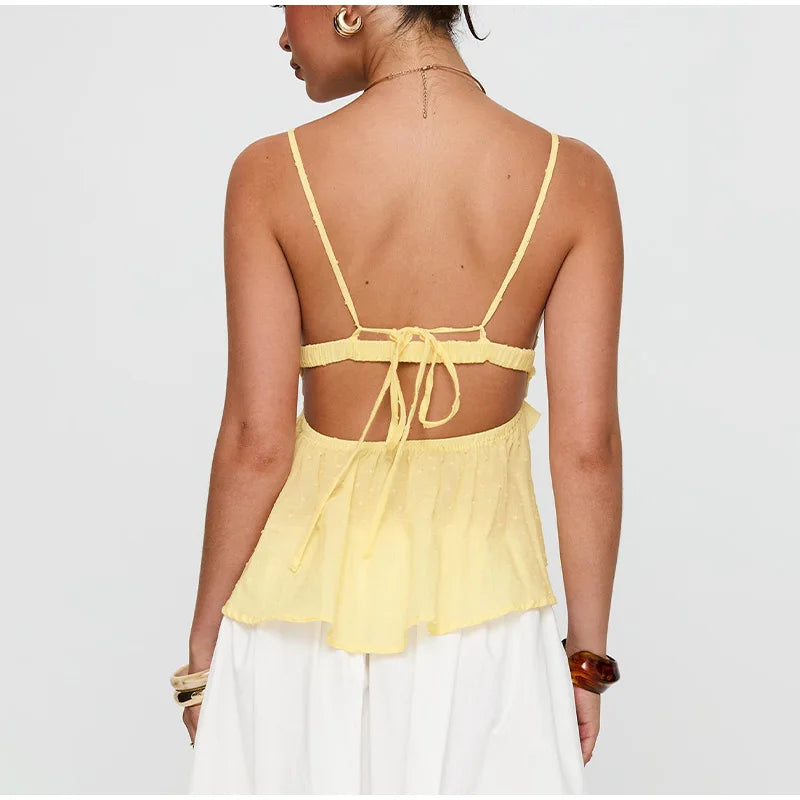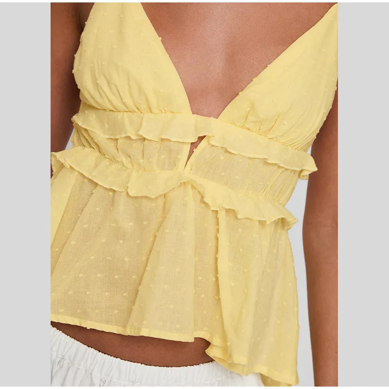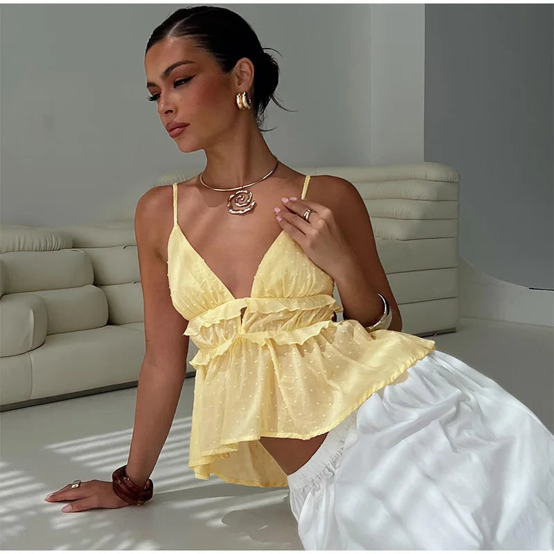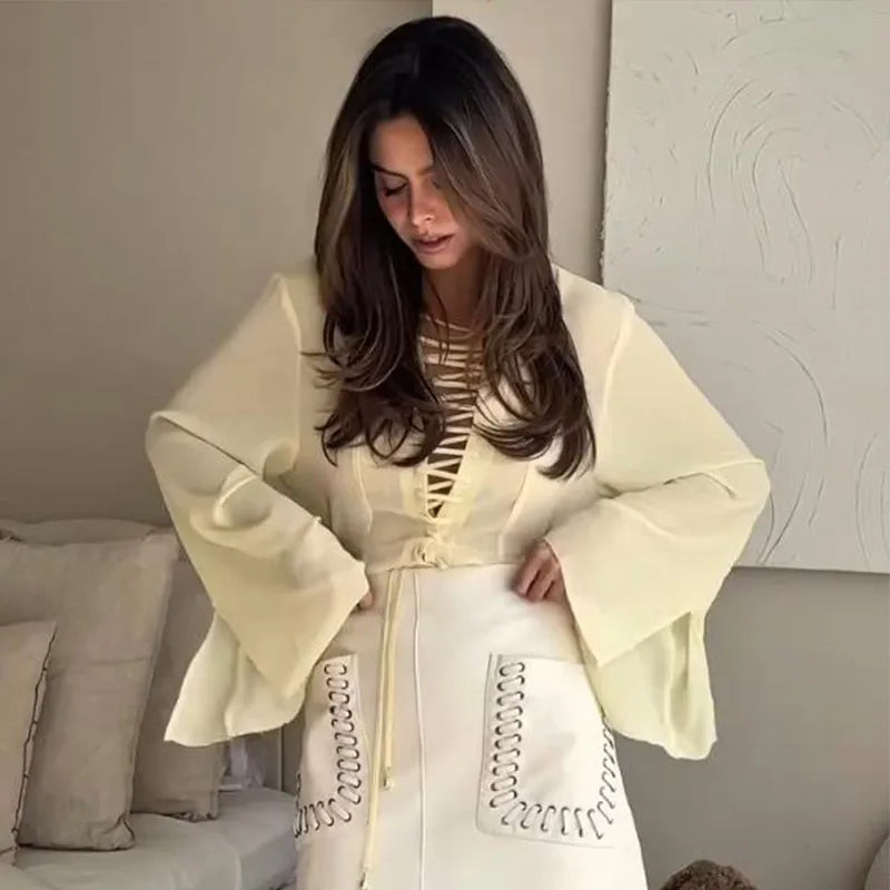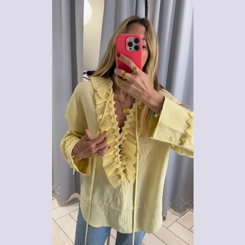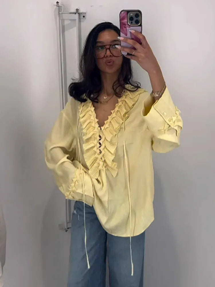 Women Casual Yellow Ruffles Tops Fashion V Neck Lace Up Long Sleeve Loose T Shirt 2025 Summer Lady High Street Commute Clothing