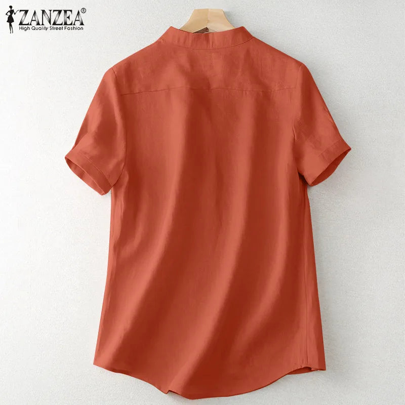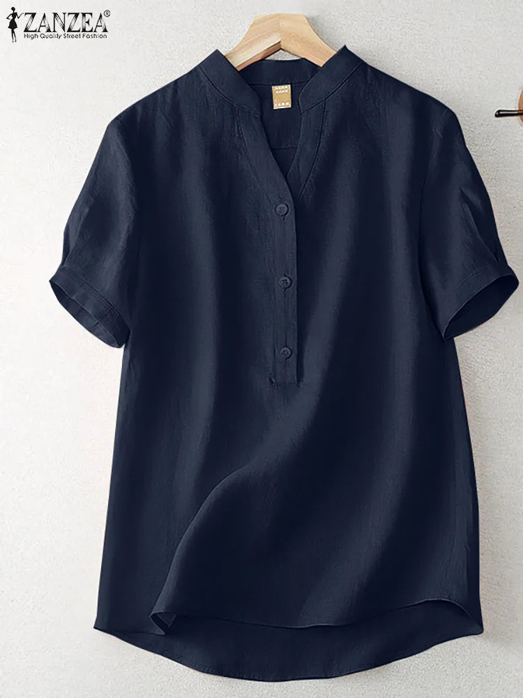 ZANZEA Summer Elegant Loose Chemise Cotton Blouse Vintage OL Work Tunic Tops Women Casual Solid Shirt V Neck Short Sleeve Blusas