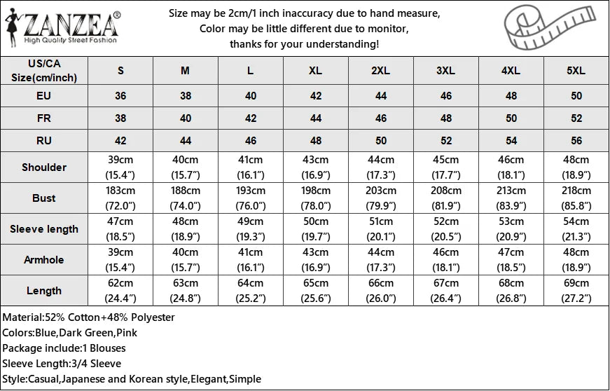 Material:52% Cotton+48% Polyester Colors:Blue,Dark Green,Pink Package include:1 Blouses Cutting:Loose Stretch:Not Stretchable Collar:Stand Collar Sleeve Style:Dolman Sleeve Sleeve Length:3/4 Sleeve Pattern:Solid Thickness:Thin Style:Casual,Japanese and Korean style,Elegant,Simple Season:Spring,Summer,Autumn Occasion:Daily,Simple,Casual Label: Yes Attention: 1. Due to different computers, there may be subtle color difference between the object and the image. Please don't shoot if you mind. Thank you. 2. There may be manual measurement error of 1-3cm. Please understand the inconvenience. 3. Please refer to the real object. The model pictures are for reference only. 4. Attention!!! Please check the size chart carefully before ordering." |
